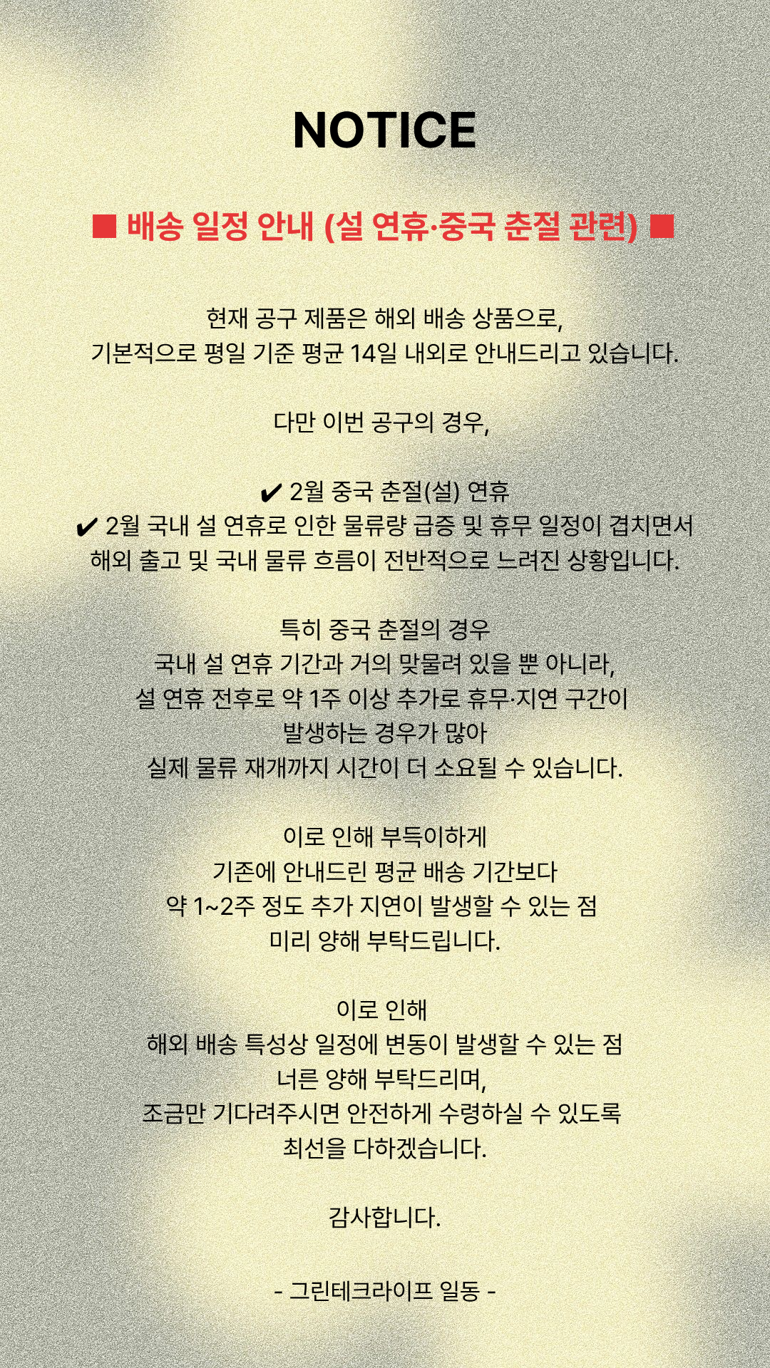 배송기간 영업일 기준(주말, 공휴일 제외) 평균 2~3주입니다
